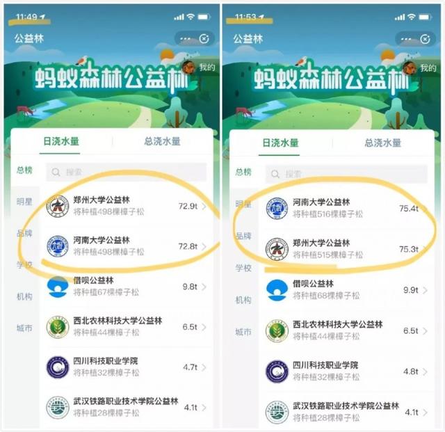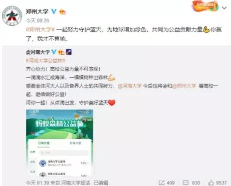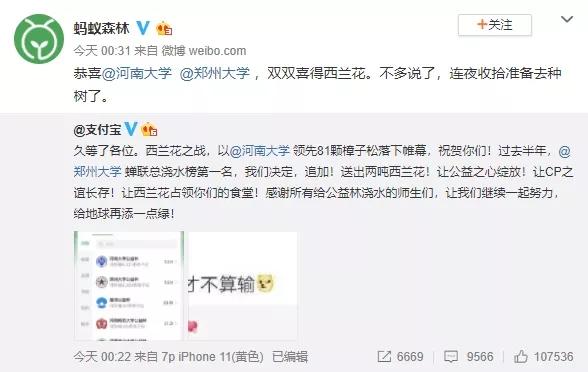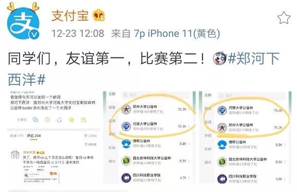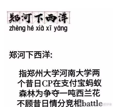 2015年11月11日,这组CP造出来的词“郑河下西洋”,如今,也被网友赋予了新的意思:指的是两所大学支付宝蚂蚁森林公益林battle浇水浇出了一个大西洋。