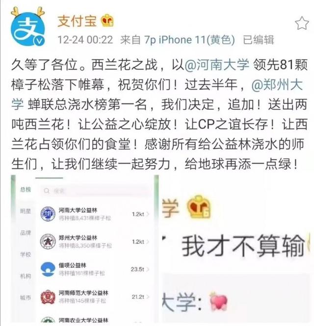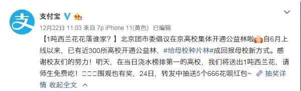 当然,这都不是白浇的,12月22日,支付宝官方微博发布消息,只要12月23日浇水榜排第一的高校,将可以免费获赠一吨西兰花。