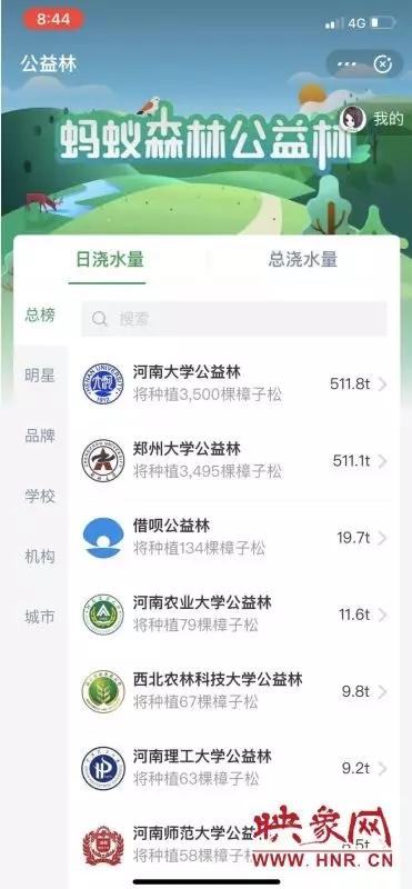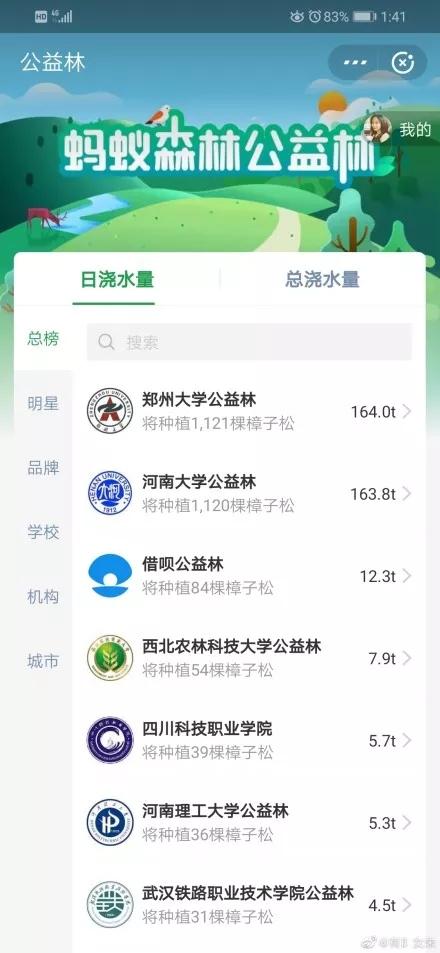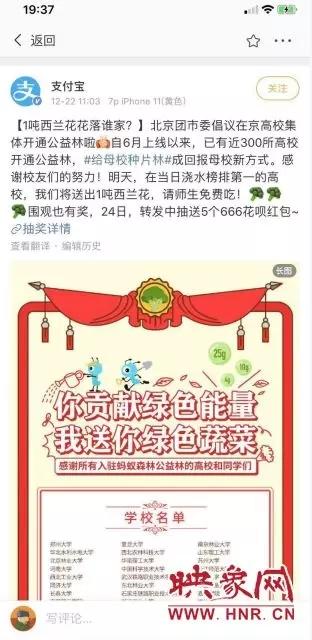 目前,河南已有郑州大学、河南大学、华北水利水电大学等30所高校开通公益林,累计浇水量超过3.1亿克,位居全国前一,相当于种下2100多棵樟子松。和校友们一起在蚂蚁森林里给母校种一片公益林,成为许多人生活中的日常。