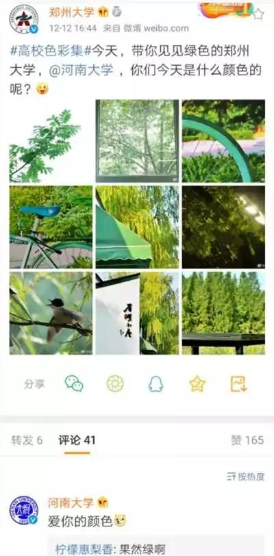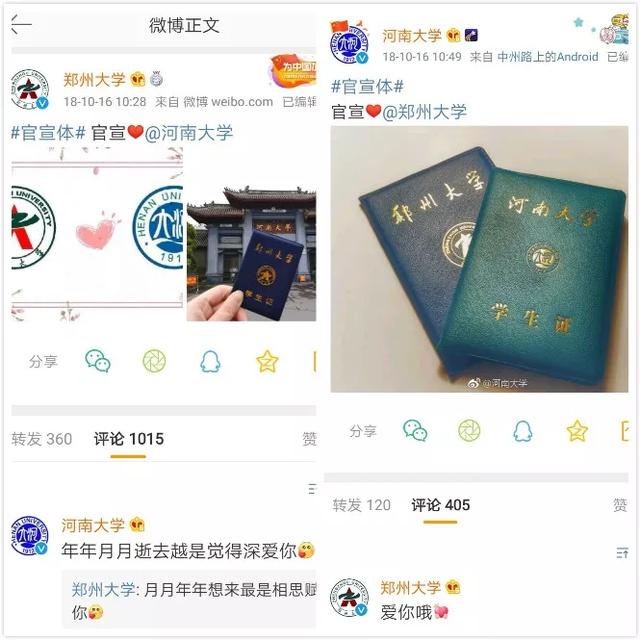 说起来,郑州大学和河南大学一直是最强CP。两校经常在微博上眉来眼去,深情款款。2018年10月16日,对,就是赵丽颖和冯绍峰“官宣”结婚那天,这俩学校也“官宣”了!