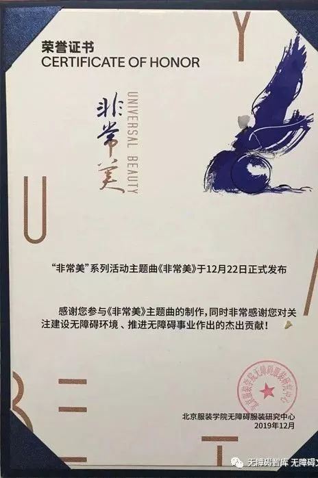 我国第一首无障碍专题歌曲——《非常美》主题歌首发:2019年12月22日,在北京服装学院“非常美”无障碍服装品牌发布会上,举行了我国首个无障碍专题歌曲——“非常美”系列活动主题歌首发式。由骆燕作词、潇萍谱曲的“非常美”主题歌曲现场发布;由北京市怀柔区肢残人协会主席宋继鸿,中国康复研究中心音乐治疗师、录音师宋宜川,北京服装学院在读学生徐子超、梁馨茹等4位歌手激情演唱;残健融合、完美演绎,为历时半年的“非常美”主题歌曲征集活动画上圆满的句号。
