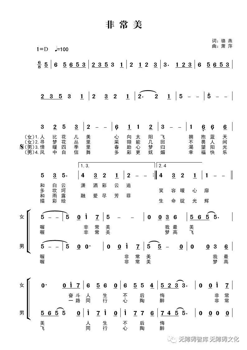 《非常美》主题歌歌词:人比花儿美,心向太阳飞,拥抱蓝天和白云,潇洒彩云追;寻梦花丛里,采撷能几回,不畏人间多坎坷,笑容暖心扉。情暖四季里,春助心梦归,渴望阳光和雨露,融爱尽芳菲;风中自信舞,多彩更妩媚,幸福快乐描彩绘,生命绽光辉。 噢——非常美、我最美,奋斗人生不后悔;非常美、爱相随,人间有情春生晖;非常美、梦高飞,一路同行心陶醉;非常美、我最美,大美无障爱,心梦在高飞。“非常美”主题歌以轻快昂扬的优美曲调,展现了轮椅上追梦人的自信与美丽,积极温暖的歌词抒发了残疾人对美好生活的向往与期盼,描绘出一幅残健融合、平等共享、怡心怡情、汇爱如流的幸福和美的生活画卷。