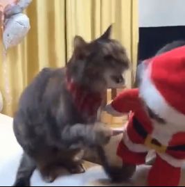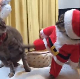 这名网友家里养了两只猫咪,他从网上给毛孩子们买了圣诞套装后就开始为它们穿戴起来,可刚给一只猫咪穿好后,还没来得及给另一只猫咪穿戴,怎料没穿圣诞套装的猫咪对另一只猫发动了进攻,对着穿好圣诞套装的猫咪上前就是一爪,嘴里还喃喃地发出不安逸的声音。