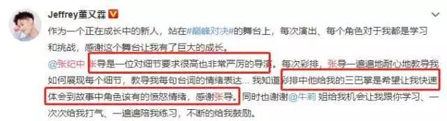 而董又霖也随后在微博上表示对张纪中的感谢,表示非常理解张导的严格要求,是他的三巴掌让他可以快速体会到故事中角色该有的愤怒情绪!