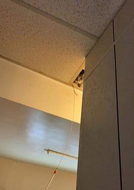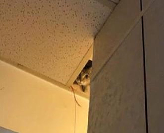 女子心慌,小心翼翼地抬起头看到天花板的小洞口里有个什么东西,女子以为是老鼠,拿手机放大一瞧却不知道该怎么办了,原来是自家猫咪爬上了天花板。