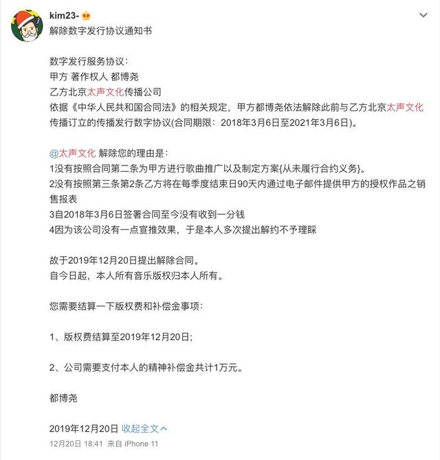 其实艺人与公司的积怨早已存在。早在去年12月,太声文化签约艺人@K邵庄 就在微博单方面提出解约声明。之后的一年里,不断有太声文化的签约艺人单方面在微博提出解约,并对公司进行声讨。