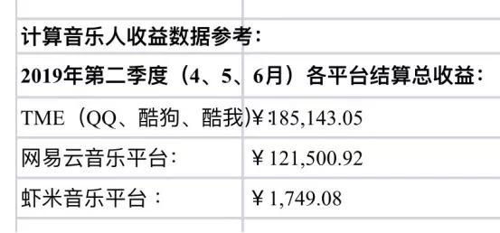 那么,太声文化是如何与音乐人结算的呢?在音乐人H给音乐先声提供了一份太声文化发给他的2019年第一季度结算报表中,明确写出了音乐人版权收益的计算公式:签约艺人的收益=(各平台结算总收益)✖️(音乐人歌曲在平台整个季度付费用户中的使用量/太声所有歌曲在平台整个季度付费用户使用量总和)✖️50%。