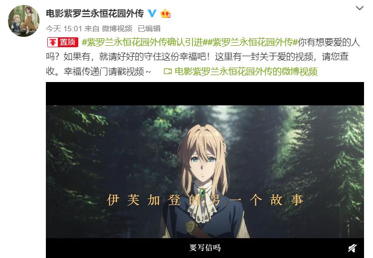 12月25日,京都动画《紫罗兰永恒花园外传:永远与自动手记人偶》官博发文宣布影片将引进中国内地公映,并公开了简体中文预告及海报,目前暂未定档。据悉,《紫罗兰永恒花园》又名《薇尔莉特·伊芙加登》,由日本小说家晓佳奈原作的同名轻小说改编。电视动画于2018年1月在日本首播,内地由B站独家播放,在海内外都获得了不错的口碑。消息一出,网友纷纷表示期待。