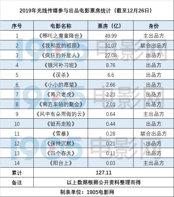 易巧认定“这是个天才”,饺子认为“终于不再是骗子。”2019年暑期档,《哪吒》横空出世,再次点燃国漫崛起的希望之火。据统计,截至12月26日,2019年光线传媒参与了14部国内上映院线电影的出品,累计票房127.11亿。