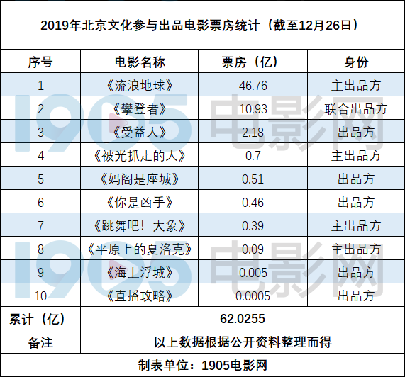 据统计,截至12月26日,2019年北京文化参与了10部国内上映院线电影的出品,累计票房62.025亿,位居新贵影企出品作品票房榜亚军。相对2018年连续押中《我不是药神》、《无名之辈》,2019年爆款捕手北京文化的准心有些失准。