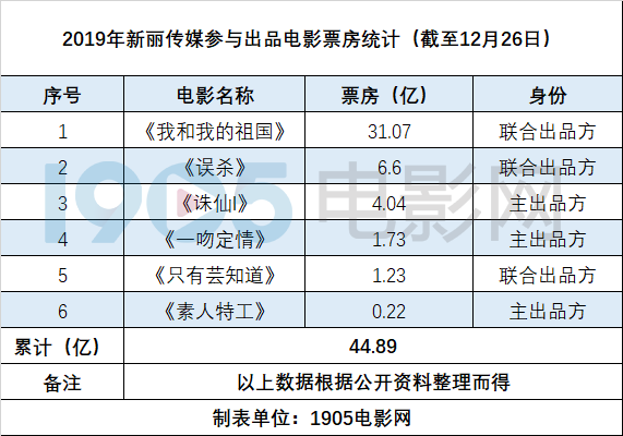 2018年贺岁档,新丽传媒主控的翻拍片《来电狂响》成为档期最大惊喜。2019年,公司同样参与了翻拍片《误杀》的出品。据统计,新丽传媒参与了6部大银幕作品的出品,累计票房44.89亿。三部主出品影片中,票房最高为4.04亿的《诛仙I》。