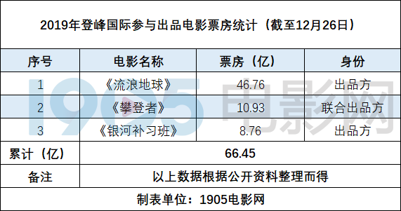 吴京身为大股东的登峰国际凭借《攀登者》、《流浪地球》、《我和我的祖国》三部作品,以66.45亿出品成绩位居新贵影企之首。