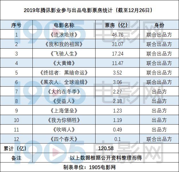 截至12月26日,腾讯影业参与了12部电影的出品。其中,联合出品方身份投资的作品为7部。值得一提的是,其联合出品的进口片《大黄蜂》取得了11.47亿票房,《终结者:黑暗命运》内地表现不及预期仅收获3.52亿票房。在国际化探索的道路上,腾讯影业有得有失。