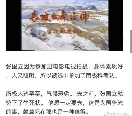 1988年,张国立在拍摄记录南极科考的电视剧《长城向南延伸》时,遭遇巨大冰崩,他冒着生命危险炸开了浮冰,科考船成功脱困,张国立荣立集体一等功和个人二等功。