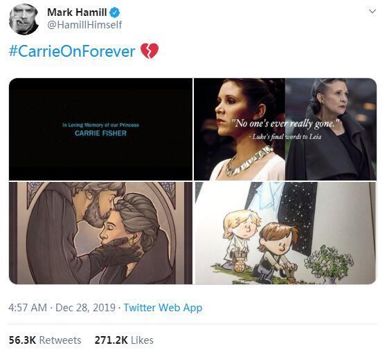 时光网讯3年前,“莱娅公主”凯丽·费雪在洛杉矶与世长辞,当年的她刚刚完成《星球大战:最后的绝地武士》拍摄工作(影片要1年后才公映),近日在《星球大战:天行者崛起》中也露了脸。“卢克”马克·哈米尔也回归出演了本作,他近日在推特上表达了自己对于这位多年老友的思念。