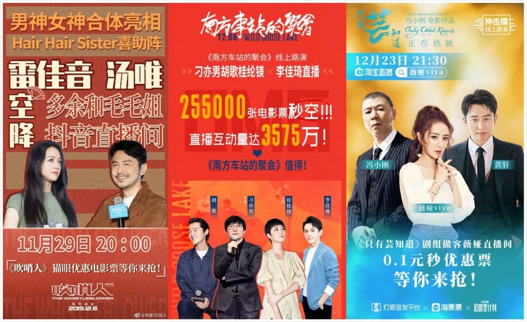从此之后,《吹哨人》《南方车站的聚会》《只有芸知道》相继尝试了这种直播卖票的模式。每一次也都能在很快的时间内把电影优惠券卖出,同时还能获得一定的时间与网友互动,接触并下沉到三四线城市,带来一定量的曝光。
