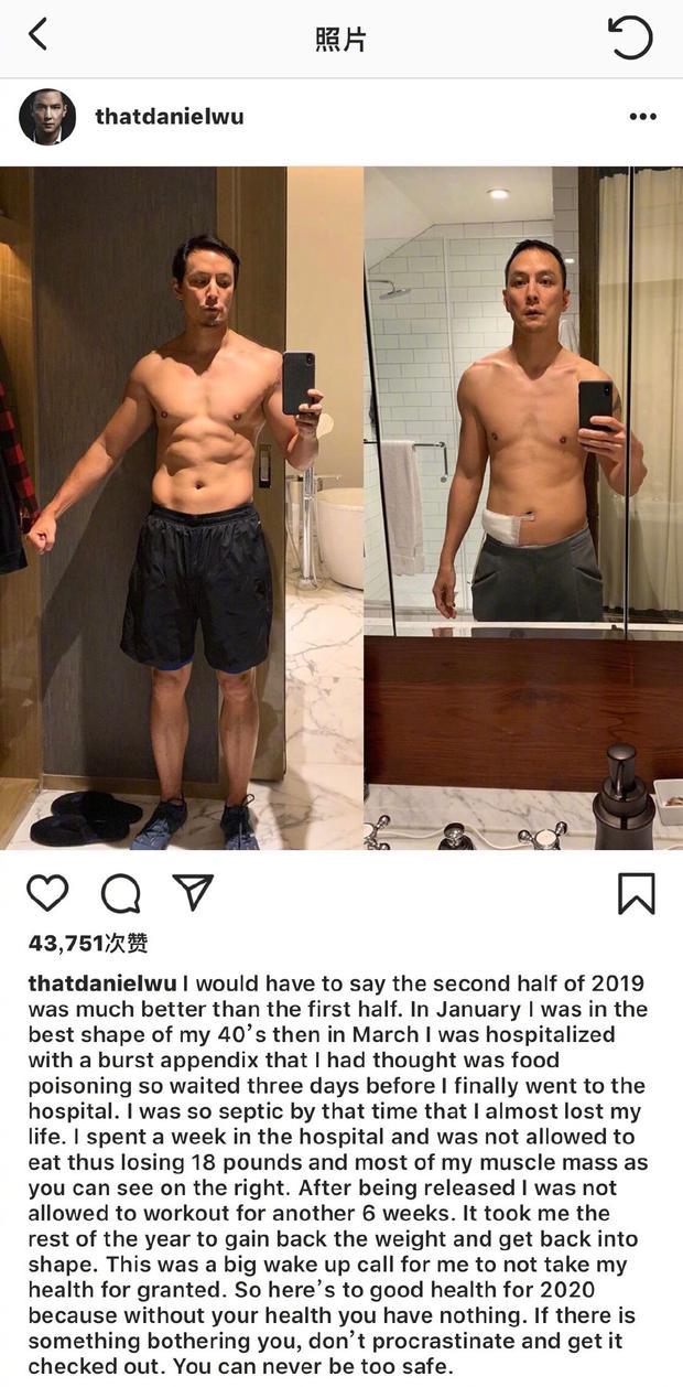 “2019年下半年比上半年好得多。1月份,我的身材达到了40多岁以来的最好状态。3月份,我因阑尾炎破溃穿孔住院治疗。一开始我以为我是食物中毒,所以等了3天才去医院,当时的严重程度差点让我失去了性命。”他写道。