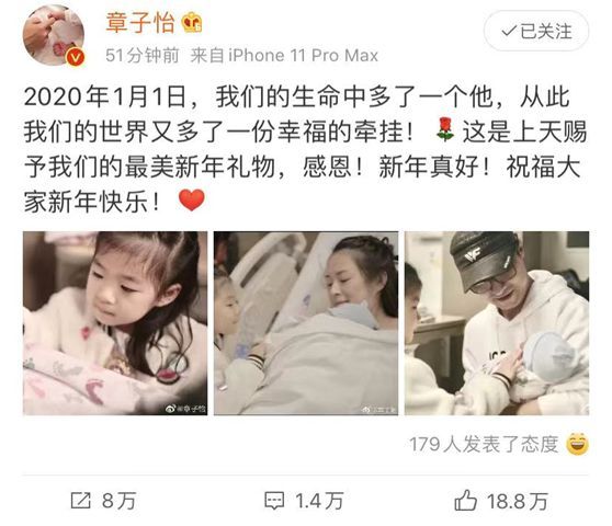 章子怡中午发微博宣布二胎生子,称“2020年1月1日,我们的生命中多了一个他”,“这是上天赐予我们的最美新年礼物,感恩!”↓