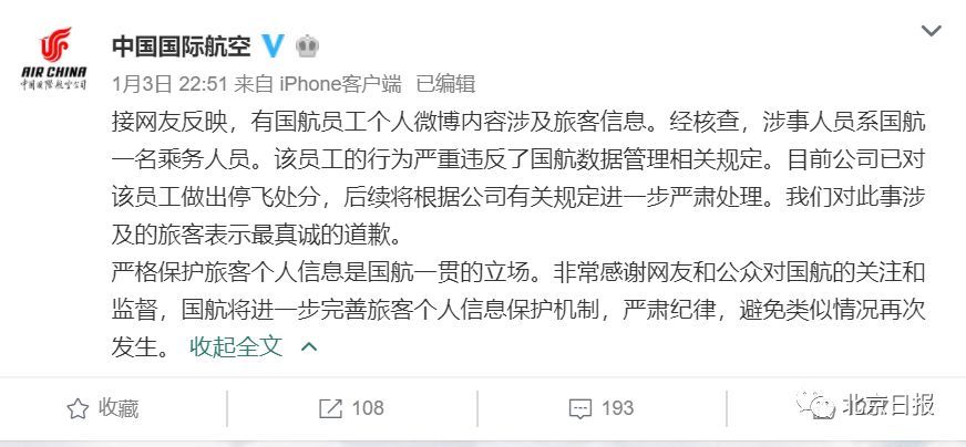 1月3日晚10时51分,中国国际航空在官方微博回应“员工泄露乘客信息”一事:接网友反映,有国航员工个人微博内容涉及旅客信息。经核查,涉事人员系国航一名乘务人员。该员工的行为严重违反了国航数据管理相关规定。目前公司已对该员工做出停飞处分,后续将根据公司有关规定进一步严肃处理。我们对此事涉及的旅客表示最真诚的道歉。
