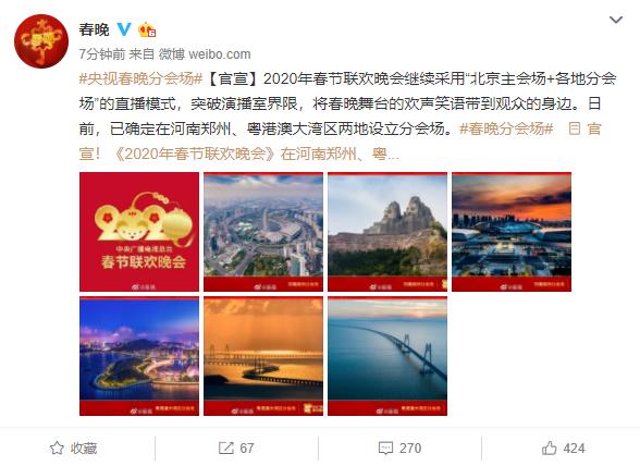 2020年春节联欢晚会继续采用“北京主会场+各地分会场”的直播模式,突破演播室界限,将春晚舞台的欢声笑语带到观众的身边。日前,已确定在河南郑州、粤港澳大湾区两地设立分会场。