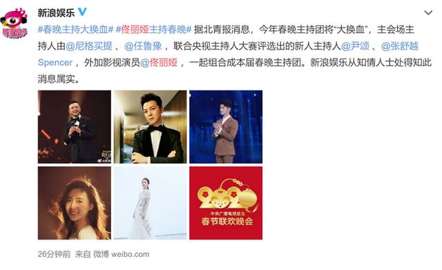14日,央视鼠年春晚第一次联排在央视老台进行,主持人阵容曝光,女星佟丽娅加盟主持,与尼格买提、任鲁豫、张舒越、尹颂等共同主持,此次央视主持团“老人”消失,取而代之的是都是比较新的面孔,佟丽娅更是第一次主持这么全国瞩目的盛会。