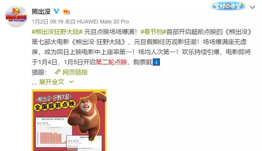 今年,在推出常规预热物料外,也有几部电影抢先一步与观众见面。2020年1月1日,熊出没系列第7部《熊出没•狂野大陆》率先开启了全国点映,并收获了不错的评价,据电影专资办数据,截至16日17时,累计票房已达3580万。