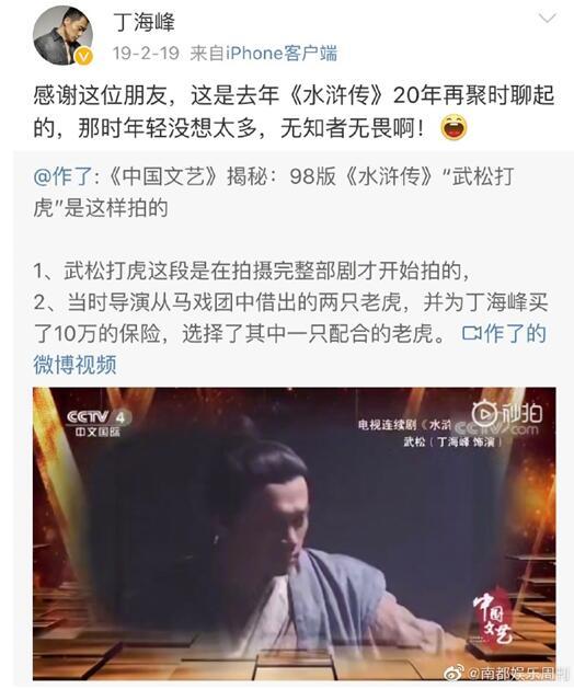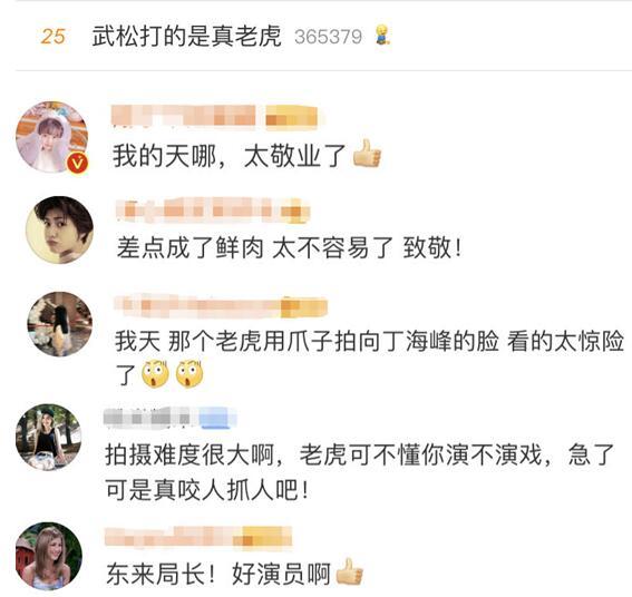 27日,CCTV4中国文艺在官方微博称,98版《水浒传》“武松打虎”里打的是真老虎,在那个没有特技和抠图的年代,“‘武松’的扮演者丁海峰就是这样勇敢地直面真老虎,必须点赞。”“那个年代的演员对艺术的执着追求,值得敬佩!是真•演员们的敬业,成就了不可替代的经典!”