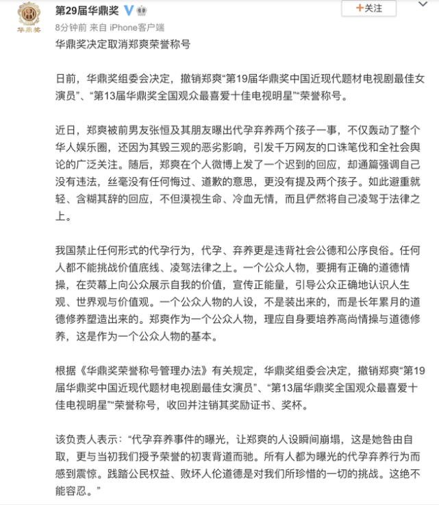 根据《华鼎奖荣誉称号管理办法》有关规定,华鼎奖组委会决定,撤销郑爽“第19届华鼎奖中国近现代题材电视剧最佳女演员”、“第13届华鼎奖全国观众最喜爱十佳电视明星”“荣誉称号,收回并注销其奖励证书、奖杯。
