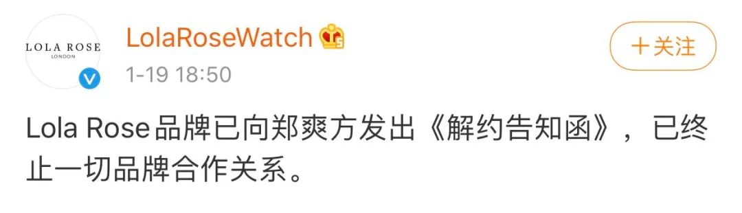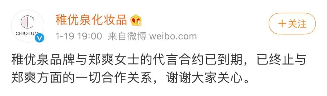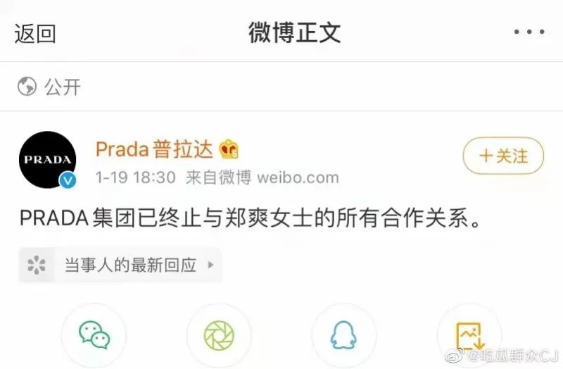 刚刚签约的PRADA也在官方微博删除了涉及郑爽的单人微博。昨日(19日)晚六点半,Prada(普拉达)在官方微博宣布已终止和郑爽的所有合作关系。这距离1月11日宣布郑爽为代言人仅八天。