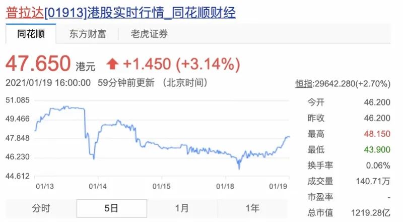 几天前的1月11日,PRADA刚通过官方微博官宣三位品牌代言人,包括蔡徐坤 、春夏和郑爽。PRADA港股在1月18日下午开始下跌,最终收盘跌1.7%,报46.2港元,市值为1182亿港元。