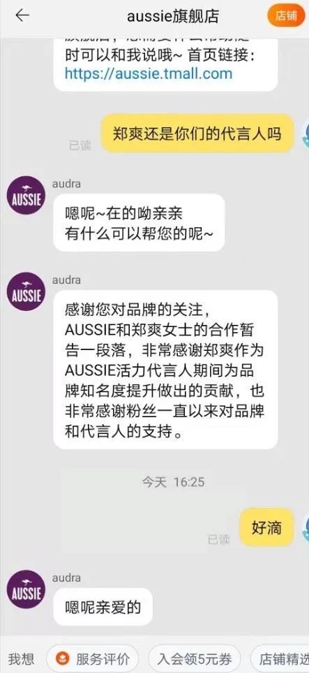对于郑爽是否将继续担任代言人,Aussie的客服明确向南都记者回应称,“Aussie和郑爽女士的合作暂告一段落”。