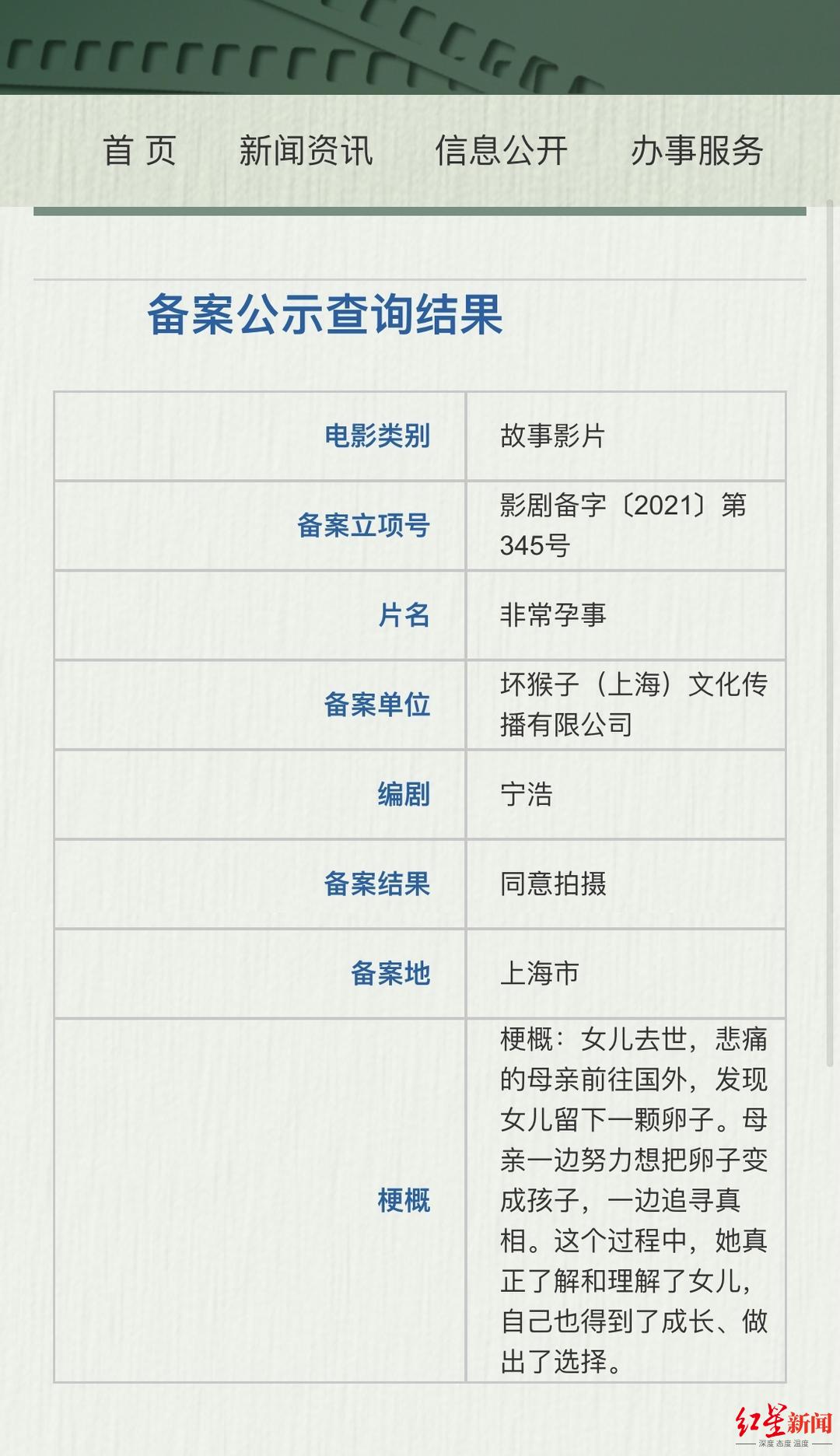《非常孕事》备案单位是坏猴子(上海)文化传播有限公司,编剧为宁浩。