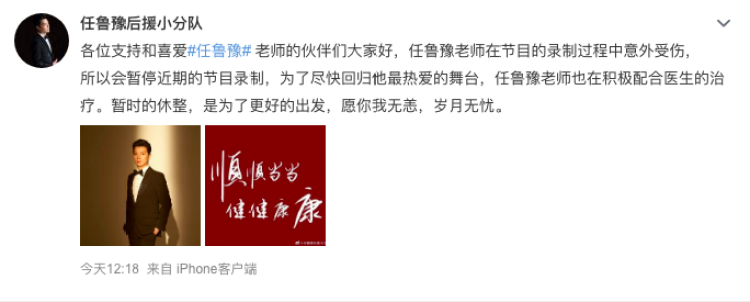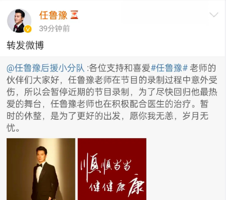 6月10日午间,@任鲁豫后援小分队 微博发布消息:各位支持和喜爱任鲁豫老师的伙伴们大家好,任鲁豫老师在节目的录制过程中意外受伤,所以会暂停近期的节目录制,为了尽快回归他最热爱的舞台,任鲁豫老师也在积极配合医生的治疗。暂时的休整,是为了更好的出发,愿你我无恙,岁月无忧。