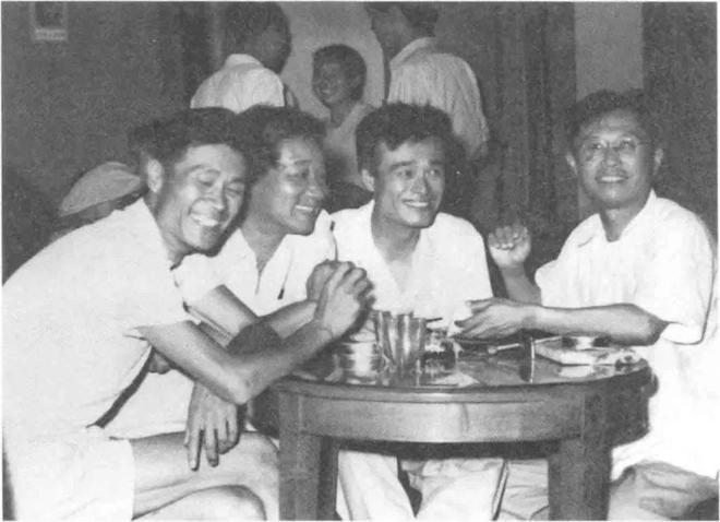 1953年北京人艺一周年院庆,曹禺院长(右一)、蓝天野(左一)