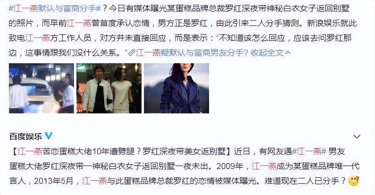 2011年江一燕跟好利来老板罗红的恋情曝出,而随之曝出的还有罗红已有家室的事实。