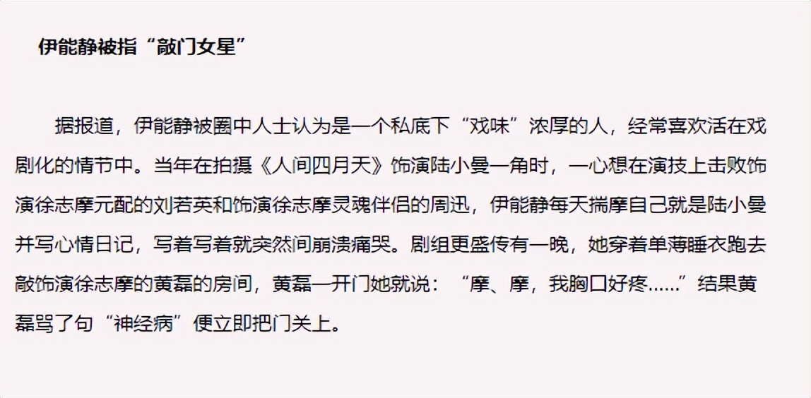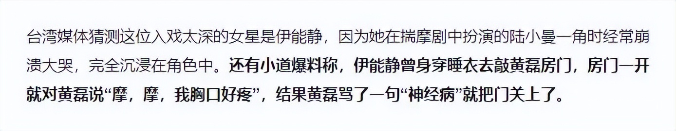 据说,“陆小曼”附体的伊能静,在敲开黄磊房间后,便矫揉造作的表示自己胸口好疼,结果只换来了黄磊一句“神经病”。