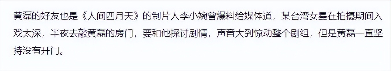 早年黄磊拍摄《人间四月天》时,就屡屡传出,有台湾女星半夜敲黄磊房门,想要和他“探讨剧情”。