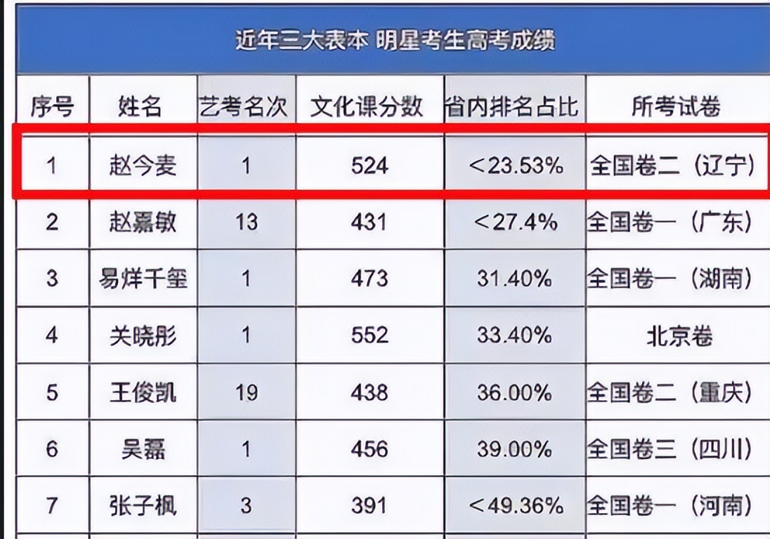 仔细看,这是一张三大表演院校近年来的学生成绩单,其中赵今麦以524的高分位列第1,同时也是中戏2020年的文化专业双料第一。