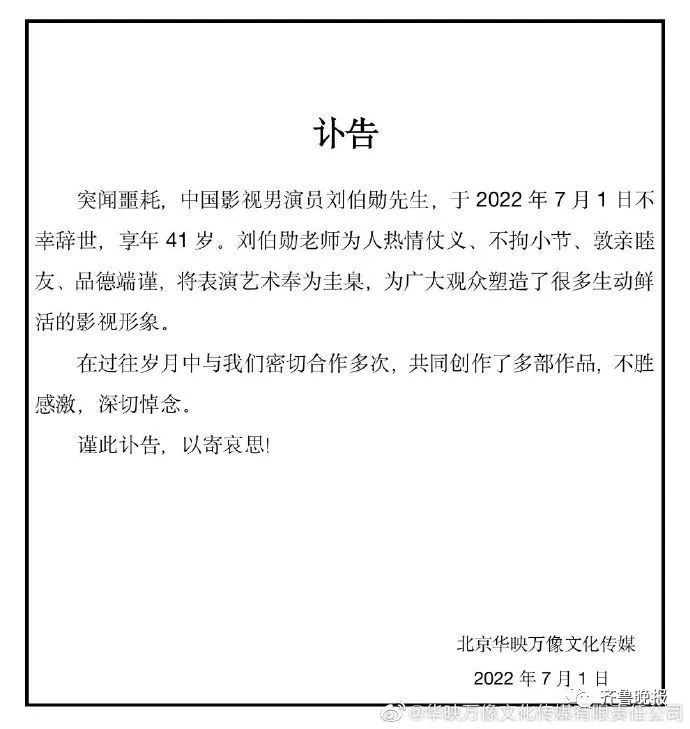 演员刘伯勋于2022年7月1日去世,