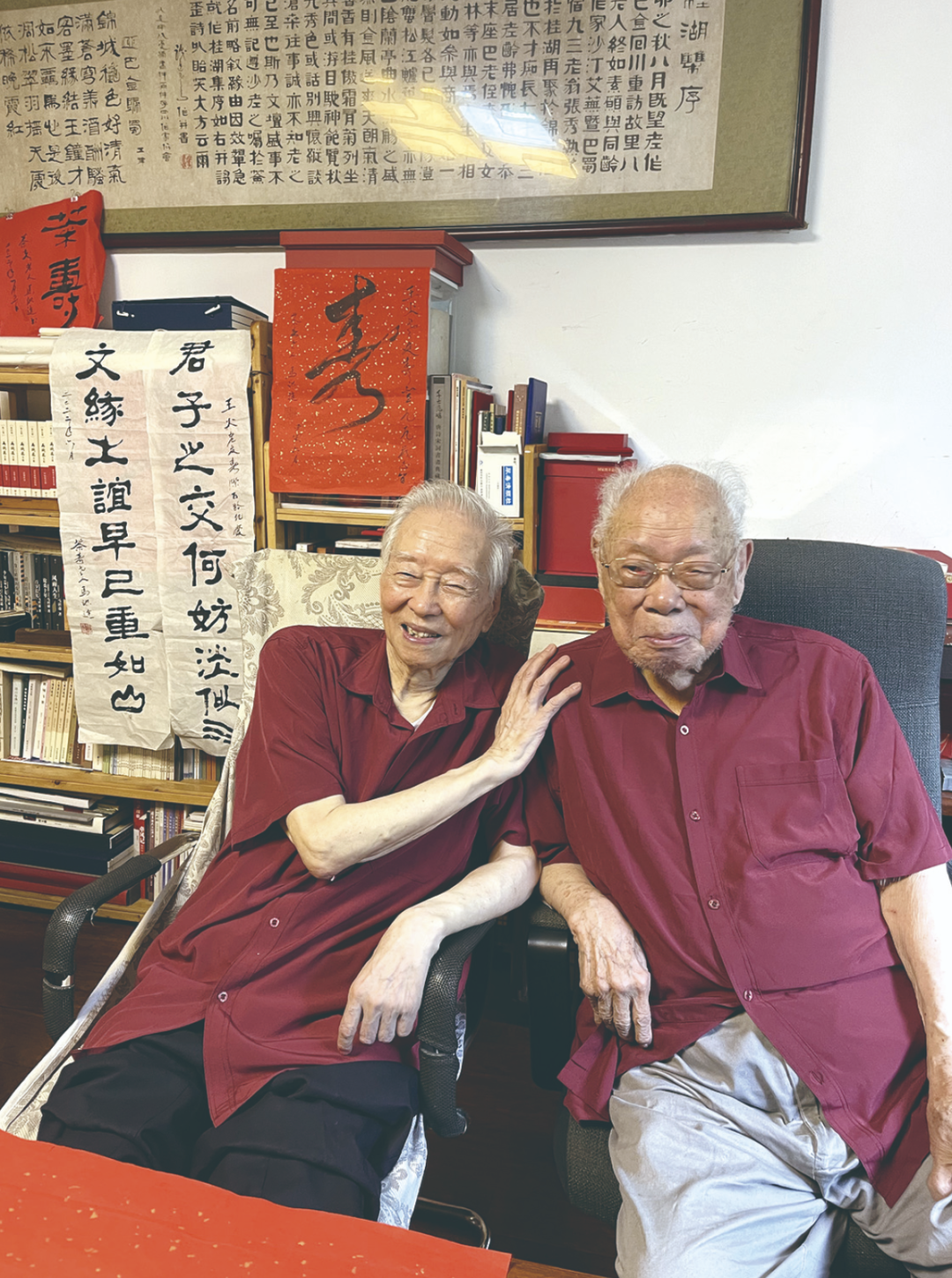 01按照中国人的习俗,2022年7月,四川知名作家王火即将迎来自己的百岁寿辰。6月开始,已经108岁的作家马识途便一直惦记着要给自己的老友王火过百岁生日。马老很想亲自去王火家中祝贺,但考虑到王老住在没有电梯的二楼,逐级爬楼对马老来说已是一件十分困难的事。经过孩子们的沟通,马老决定提前邀请王火到家中来一起为他祝寿。6月22日下午,在女儿的陪伴下,王火如约来到马老位于成都西郊的家中。一进门,两位许久未见的老友紧紧相拥。为了这次见面,王老女儿特意为老人们准备了统一的红色短袖衬衣。按照马老和王火的意愿,这次生日聚会只准备了一壶茶、一盘西瓜、一个蛋糕,他们笑称:“这是我们的下午茶时光。”为了给老友祝寿,马老特意书写了一幅“寿”字,并赋诗一首: