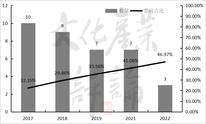 △ 2017-2022年上半年票房10亿+影片数量及票房份额
