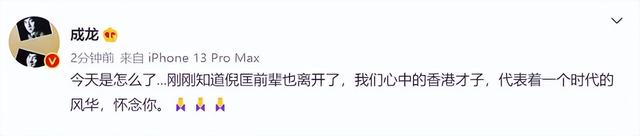 成龙发微博感叹:“今天是怎么了...刚刚知道倪匡前辈也离开了,我们心中的香港才子,代表着一个时代的风华,怀念你。”此前,他刚刚发文悼念著名导演罗启锐。
