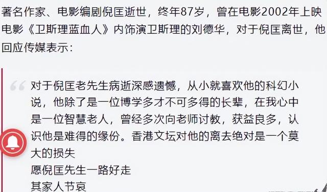 刘德华对倪匡的逝世感到遗憾,他曾经在电影《卫斯理蓝血人》当中扮演卫斯理一角色,对倪匡有很深厚的感情。他称倪匡是博学多才的长辈,是智慧老人,曾多次向老师讨教,获益良多,认识他是难得的缘分,祝愿倪匡先生一路好走。