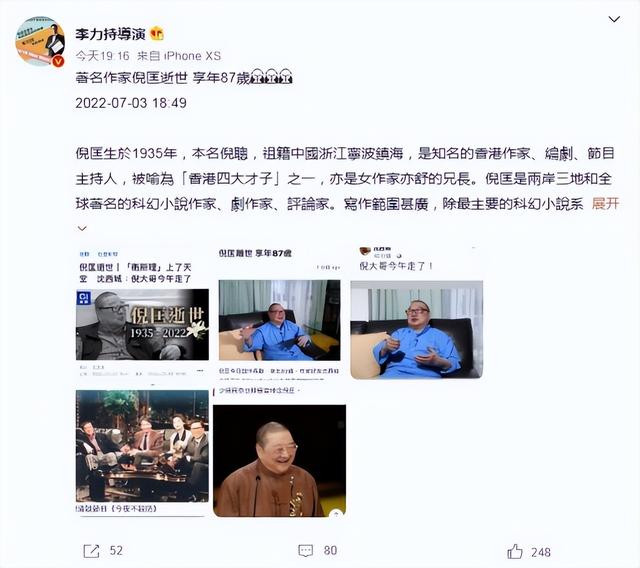导演李力持则直接放出了倪匡的资料简介,向所有人科普了倪匡的生平事迹。
