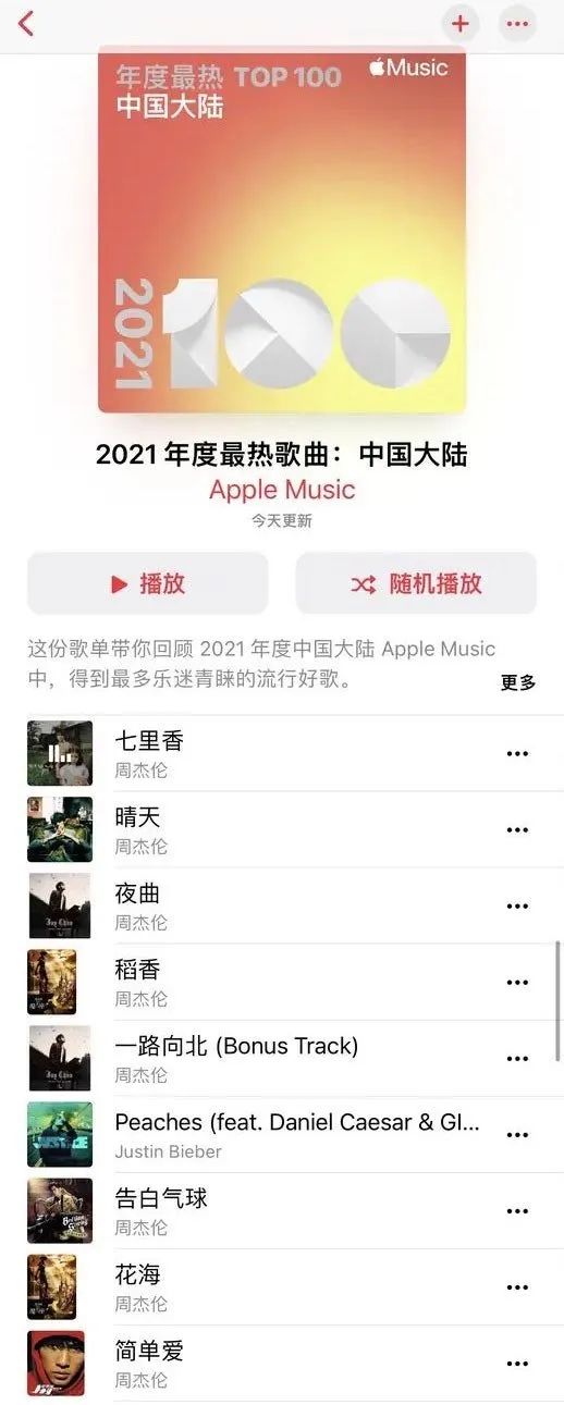 在 Apple Music 公布的中国大陆 TOP100 榜单中,周杰伦的歌曲占据半壁江山,前三名则是《七里香》、《晴天》、《夜曲》,分别诞生于 2004 年、2003 年、2005 年。