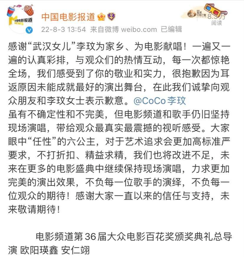 8月3日下午,电影频道第36届大众电影百花奖颁奖典礼总导演欧阳瑛鑫、安仁翊通过《中国电影报道》官方微博向李玟道歉,文中表示: