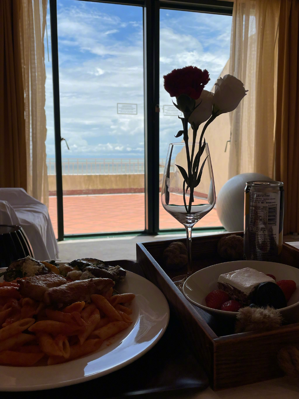 此外,床上放着的食物看上去也是非常的精美,最起码摆盘非常的好看且精致,高脚杯中还放了一朵玫瑰,尤其是她还晒出了窗外的美景,只一看就是豪华酒店必备的呀,很是会享受了。