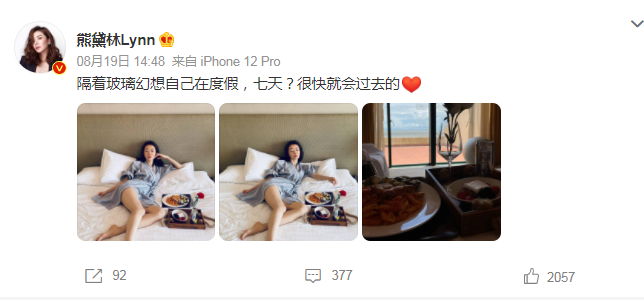 近日,熊黛林罕见地在社交平台上晒出自己穿浴袍的美照,并配文称:“隔着玻璃幻想自己在度假,七天?很快就会过去的。”看样子是在某个城市,因为疫情被隔离在豪华酒店内了,这样的心态也确实非常的好,而她晒出的美照也是引来无数网友的围观和点赞。