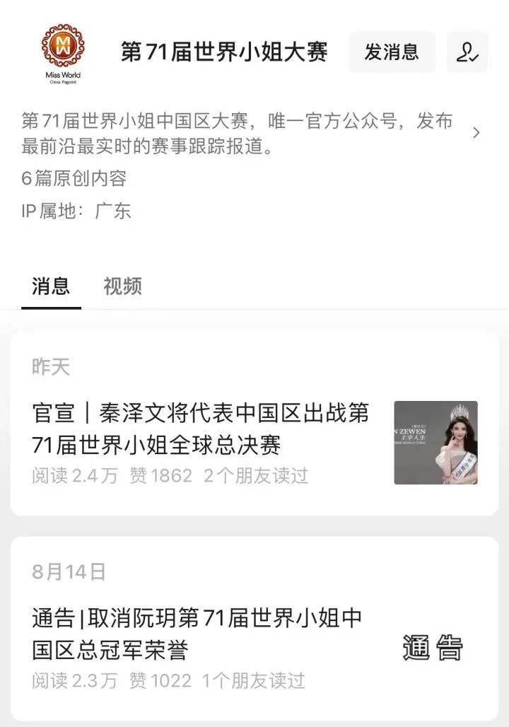 该账号在8月14号曾发布《取消阮玥第71届世界小姐中国区总冠军荣誉》的通告: