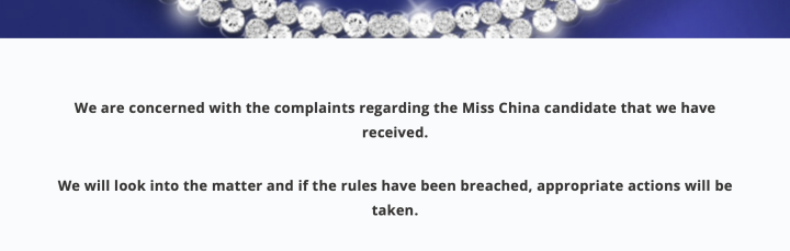 8月24日晚间,世界小姐官网发布声明称,“我们对收到的有关代表中国参加本届世界小姐全球总决赛的候选人的投诉表示关注。我们将调查此事,如果违反规定,我们将采取适当行动。”